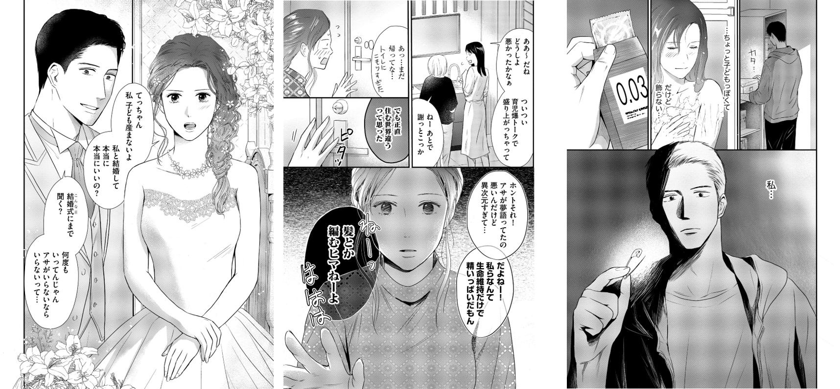 金沢アサと哲也の夫婦は意識的に子どもを持たない、共働きの夫婦だった。結婚して3年たっても、アサの考えは変わっておらず、哲也も同じ考えだと思っていた。ある日、高校の同窓会に参加したアサは、子育て中の友人たちが、子なしは気楽でいいと陰口を言っているのを聞いてしまう。帰宅後、「子どもはいなくていい」と哲也がなぐさめてくれるが、その言葉と裏腹に、恐ろしい行動を起こし…!?